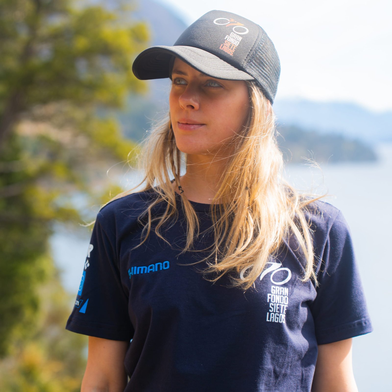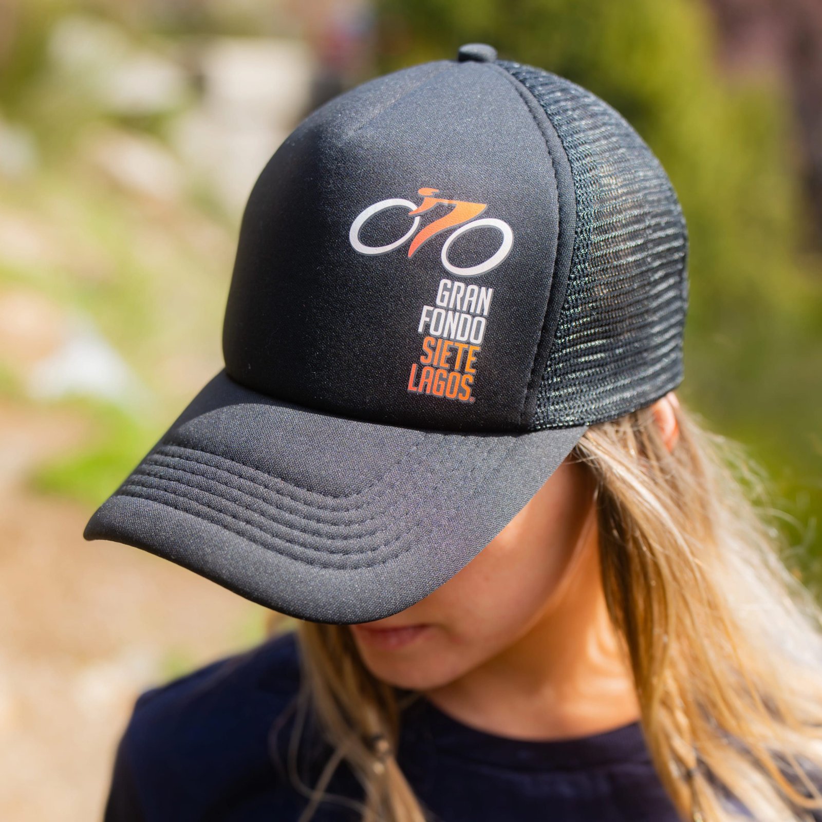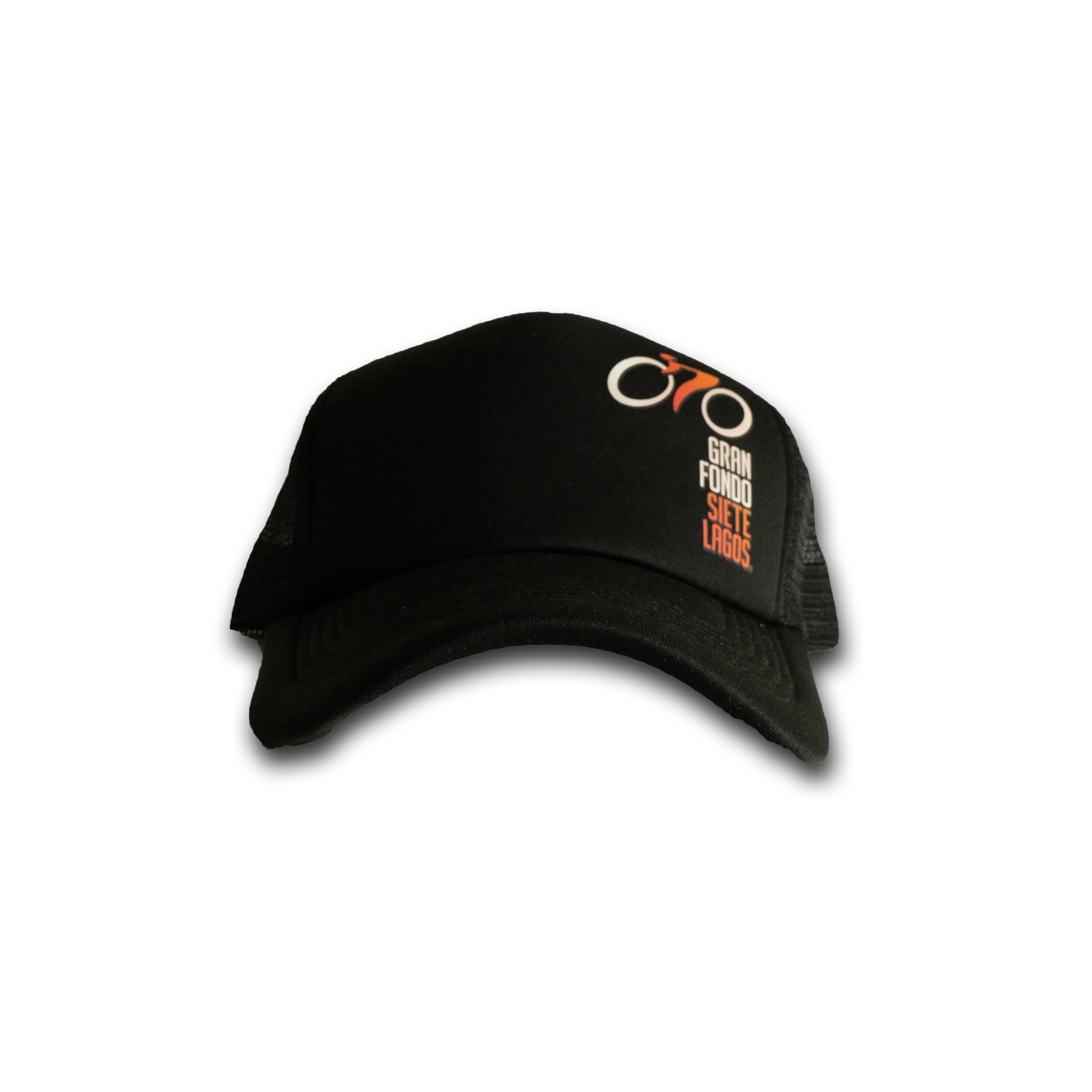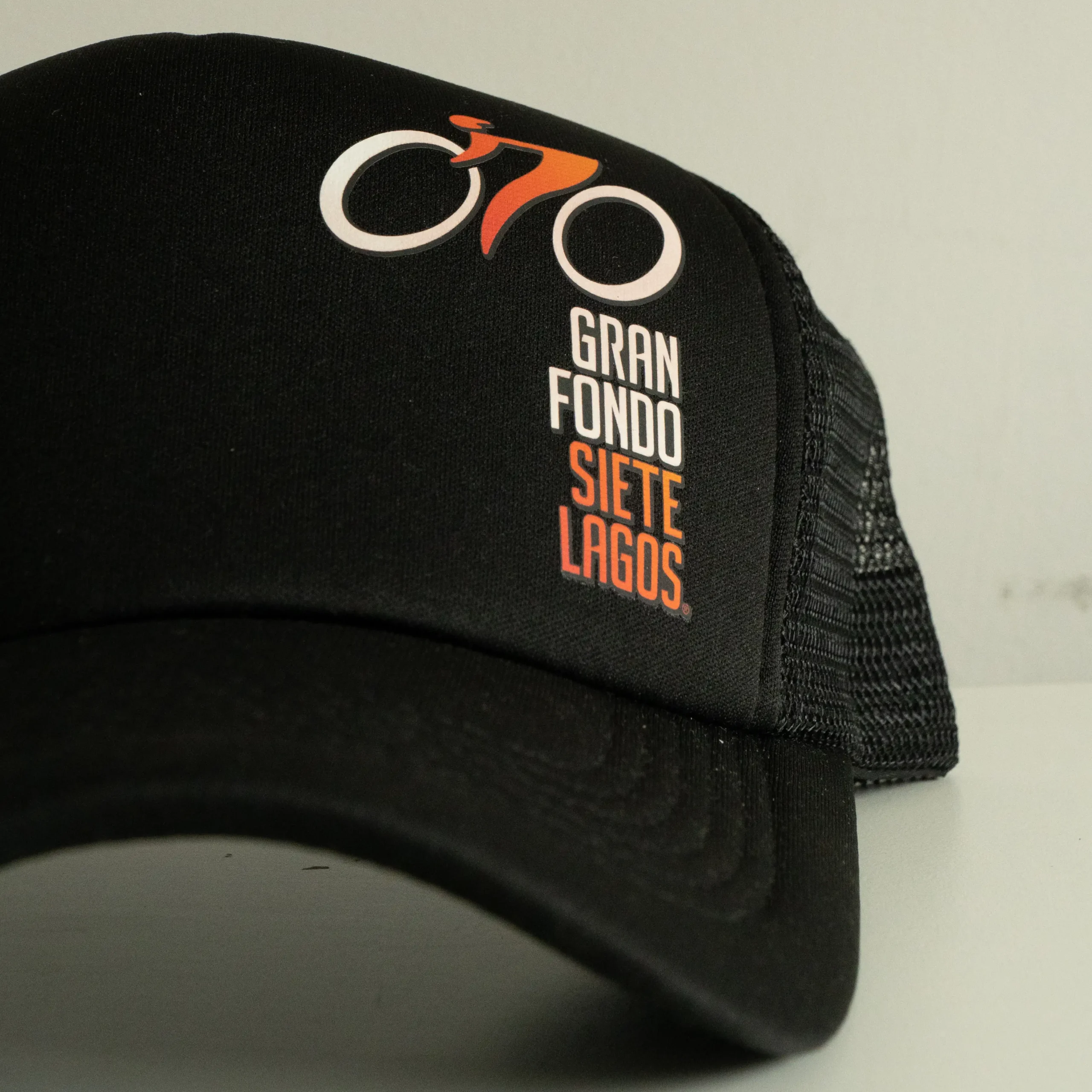 Gorra clásica tipo trucker con visera curva, red posterior y logo estampado del GF7L al frente.