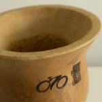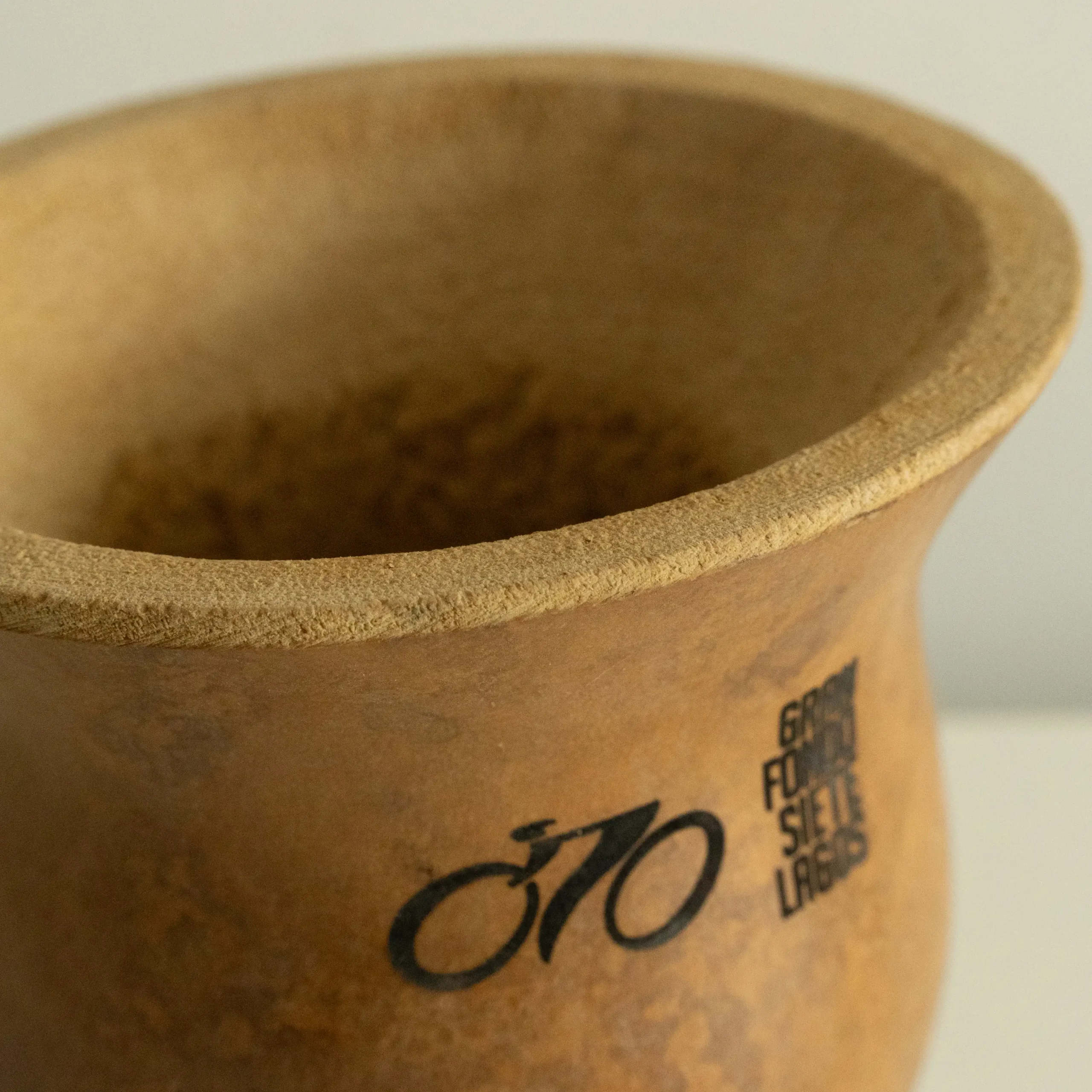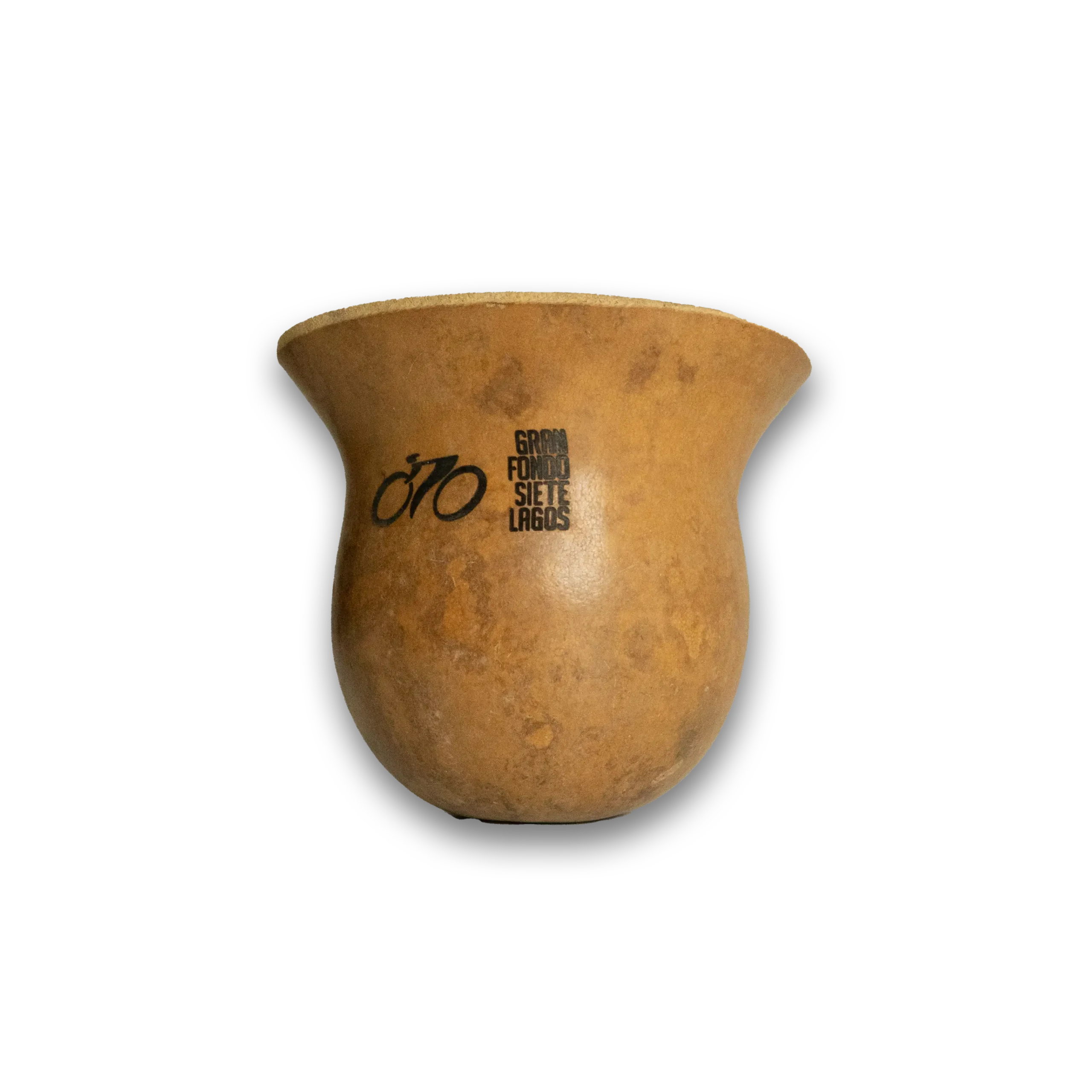 Mate de calabaza con soporte de cuero crudo, grabado con el logo del Gran Fondo 7 Lagos.